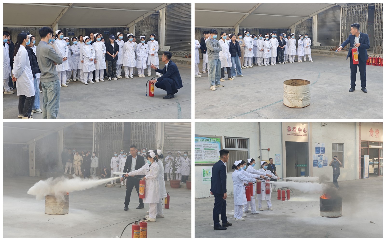 理论培训结束后,参训人员移步至体检中心门前空地进行灭火器实操演练。在专业指导下,大家依次进行实际操作,亲身体验灭火器材的正确使用方式,进一步巩固了理论知识,提升了扑救初起火灾和应急自救的实践能力。